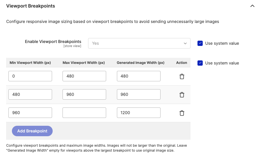 Viewport Breakpoints configure responsive image sizing based on viewport width, avoiding unnecessarily large images being sent to smaller screens.